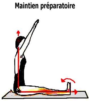 - Position: jambes allongées et serrées, bras tendus, paumes vers le haut.