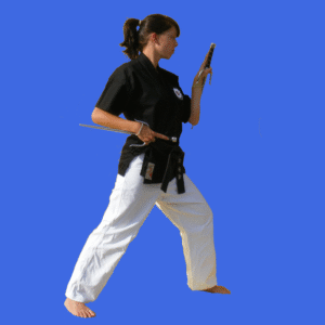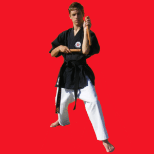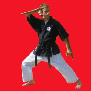 Le Tonfa : cette arme est à l’origine de celle utilisé actuellement par certains membres des forces de l’ordre. Cependant contrairement à l’arme utilisé par nos forces de l’ordre, le Tonfa traditionnel est en bois et possède une section plus large au niveau de la poignée si le reste de la section est ronde, ou une section carré. De plus dans le Kobudo d’Okinawa, le Tonfa est utilisé par paires. Cette arme semble avoir été à l’origine un manche sur lequel on encastrait une meule de pierre pour moudre le grain. Il existe un grand nombre de saisies du Tonfa, cependant, dans la plus commune de ces saisies, le corps de l’arme est situé vers le bas. On distingue alors deux situations ; soit la partie longue est contre l’avant-bras et alors les techniques utilisées sont très proches de celles du karaté, soit la partie longue prolonge l’avant-bras, ce qui permet une plus grande allonge. Toute la difficulté dans l’utilisation du Tonfa réside dans le passage d’une saisie à une autre ce qui nécessite un gros travail sur la saisie de l’arme.