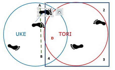Et bien la distance est raccourcie pour toucher la cible, (car le pied de Uke se retrouve à présent en avant de la ligne AB, donc plus près de Tori et cela sans rentrer dans la zone d’alerte de Tori) ce qui implique tout naturellement que Tori avec un simple recul du buste ne pourra pas éviter l’attaque de Uke.