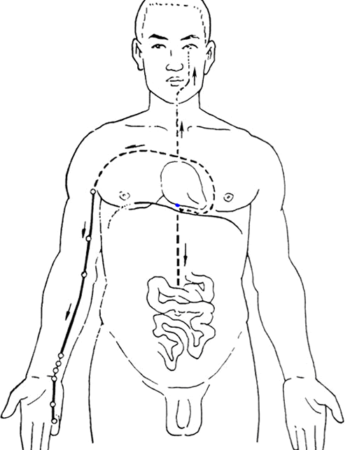 Débutant du cœur (point 1), le méridien quitte les vaisseaux sanguins et les tissus environnant le cœur (système cardiaque) et descend à travers le diaphragme (2), pour se relier avec l’intestin grêle. Une branche collatérale part du système cardiaque (3), monte en côtoyant l’œsophage, traverse la gorge (4), atteint enfin les tissus péri oculaires (5). Le tronc principal du méridien monte directement du système cardiaque aux poumons, court transversalement au creux de l’aisselle (6); il en sort (7) et se dirige obliquement vers le bas en longeant le bord cubital de la face antérieure du bras. Passant par le côté antéro-interne du coude (8), il suit le bord cubital de la face antérieure de l’avant bras, arrivant au côté cubital de l’articulation radio-carpienne (9); il avance de la protubérance du pisciforme dans l’espace situé entre les 4ème et 5ème métacarpiens (10). Longeant le bord radial de l’auriculaire, il prend fin à son extrémité (11).