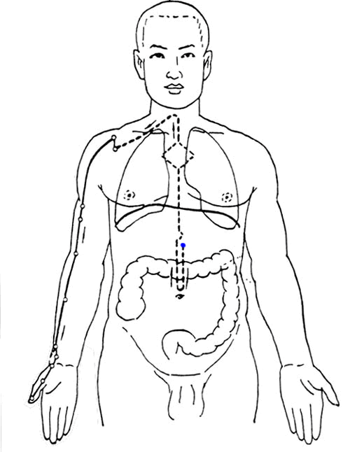 Puis il passe sur la surface antéro-interne du bras et arrive au niveau du coude. Il continue sur le milieu de la surface antérieure de l’avant-bras puis dans la gouttière radiale (point 7,8 et 9) et se termine à l’angle interne du pouce, c’est le 11ème point.