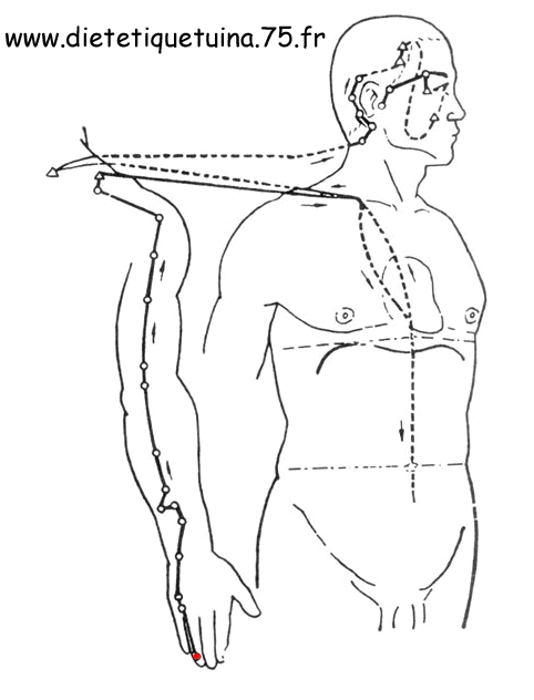 Il continue sa course le long du bras jusqu’à la partie extérieure de l’épaule au point 14 entre l’acromion et la tubérosité de l’humérus où il croise d’autres méridiens (Intestin Grêle et Vésicule Biliaire).