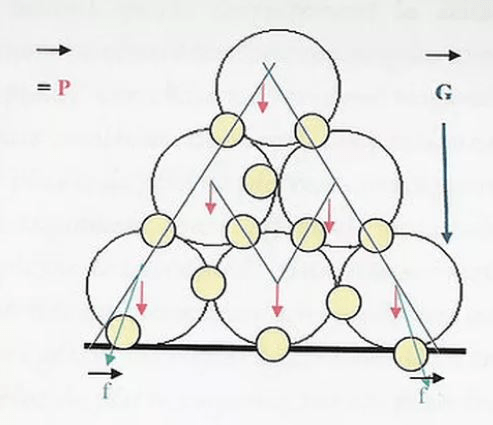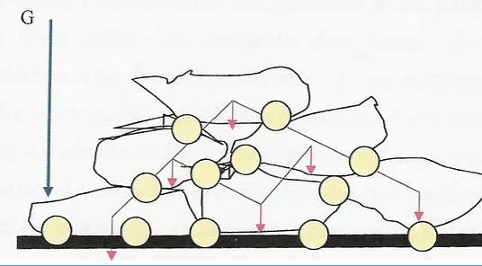 Figure 2 avec les cailloux : on retrouve dans ce second exemple, une douzaine de zones de contacts. Chaque caillou ayant son propre centre de masse G est soumis à son poids P. L’équilibre s’explique dans ce cas par des liaisons de contacts plus étroits dus à la rugosité des pierres. Le contact entre deux cailloux ne se limite plus à un seul point, mais à une surface.