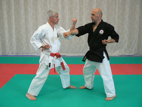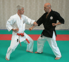 Blocage niveau bas vers l’extérieur effectué avec la partie externe de l’avant-bras (côté du petit doigt) et destiné à arrêter toutes attaques basses. Je parle volontairement de « stopper » car une jambe est grandement plus puissante qu’un avant-bras et des fractures ou cassures sont toujours possibles, même pour des personnes robustes. Tendez le poing opposé à la jambe arrière, paume vers le bas, devant vous et montez l’autre poing au niveau de l’oreille, opposée, poing vertical avec la paume vers la joue. Dans cette position vous êtes déjà en protection et pourrez profiter de l’effet ressort pour accroître la puissance du blocage. Faire glisser le poing le long du bras qui est en avant, toujours tendu, puis dans la phase finale, amenez le poing (en supination) à la hanche (Hikite) tout en descendant au-dessus du genou avant pour intercepter la frappe adverse. A ce stade le corps est légèrement de profil et l’assise parfaite. Il est important de ne pas poursuivre ce blocage au-delà de la cuisse.