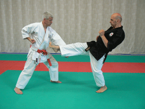 Blocage niveau bas de l’extérieur vers l’intérieur. Venir devancer l’attaque basse adverse et ensuite l’accompagner avec le poing fermé côté pouce (marteau de fer) devant votre bassin du même côté que la jambe arrière. Ne pas chercher à stopper la frappe mais l’accompagner dans sa course pour ne pas déstabiliser l’adversaire. Cette technique est effectuée avec un léger retrait de la hanche arrière afin de ne pas se trouver sur la trajectoire du coup.