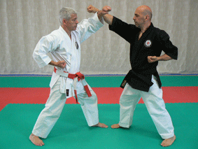 Défense niveau haut remontante (Age) effectuée avec la partie externe de l’avant-bras (côté du petit doigt). La préparation de cette technique est importante et ne doit en aucun cas découvrir notre ligne médiane. La participation active de l’autre bras permet, d’une part, de protéger son corps en cas de feinte ou d’attaque double et d’autre part, par un effet de propulsion, de décupler la puissance du bras effectuant le blocage. Tendez le bras contraire à votre position de pieds et le corps de face. Monter le poing resté en arrière, avant-bras à la verticale sur votre axe médian, jusqu’à la hauteur du front puis, le poing servant de pivot, lever le coude. Simultanément ramener le poing gauche à la hanche (Hikite. En position finale, l’avant-bras avant est légèrement oblique par rapport à vos épaules au niveau du front mais non collé, le poing avant est serré avec la paume dirigée vers l’avant.