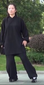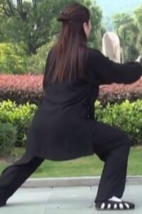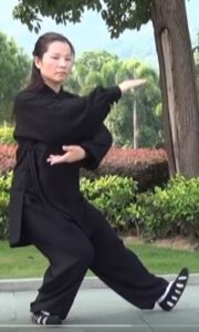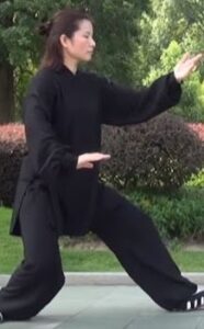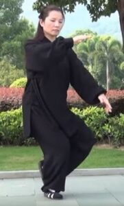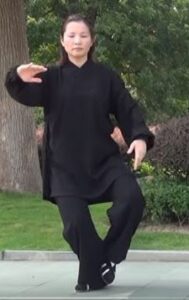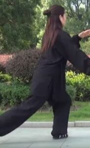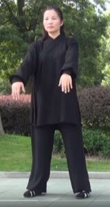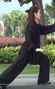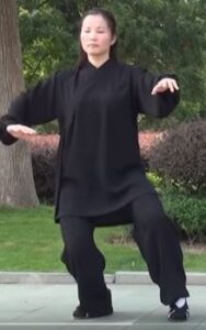 Les mains continuent à décrire le cercle horaire. La main droite devant l’épaule gauche, paume de main vers le sol. Bras gauche détendu vers le bas, paume de main vers le haut et au-dessus du genou gauche. La tête toujours à la verticale du corps, le regard resté vers l’avant. Toujours en équilibre sur le pied droit s’écarte sur la gauche, pointe de pied relevée et orientée vers l’ouest.