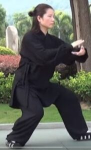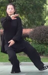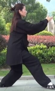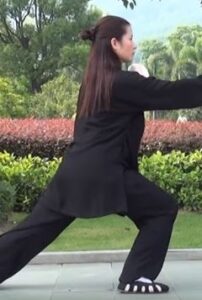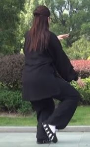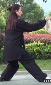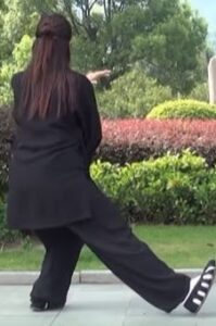 Le buste et le regard restent orientés vers le sud. Le bassin et le centre de gravité avance sur la jambe gauche. Le pied gauche s’enroule sur le sol. Le mouvement circulaire des bras en est à la phase où la main gauche se retrouve sous le coude droit.