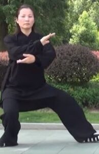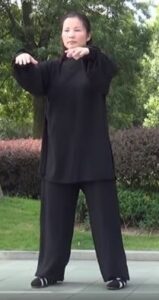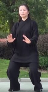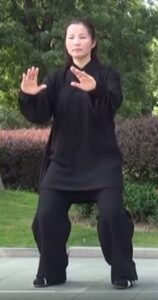 Equilibrer le poids les deux jambes équitablement. Les paumes de mains se font face avec un écart d’une longueur de votre tronc. La main gauche, paume vers le sol passe au-dessus de l’avant-bras droit sans le toucher en descendant. La paume gauche est dirigée vers le ciel. Poids du corps 50/50 sur chaque jambe.