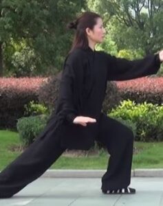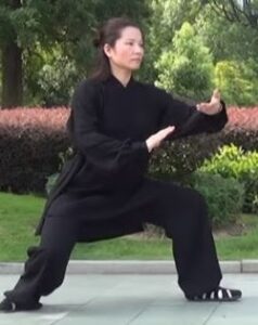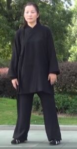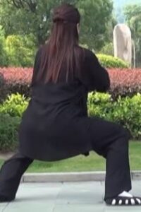 Dans une synchronisation parfaite, Membres supérieurs se meuvent ensemble avec les membres inférieurs. Le poids est en totalité sur le pied droit. Le pied gauche flex, s’approche du pied droit. Les mains vont décrire un cercle dans le sens horaire.