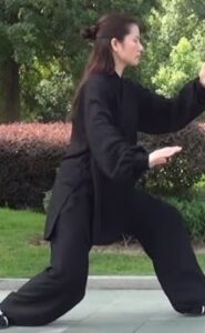 Continuer d’investir votre poids sur la jambe gauche. (70% du poids total). Genou plié à la verticale au-dessus des orteils avant. La jambe arrière est tendue sans être verrouillée. La main gauche est vers l’avant, l’avant-bras tendu sont également être verrouillé. La main droite paume vers le sol à l’horizontale. Regard au travers de la main gauche.